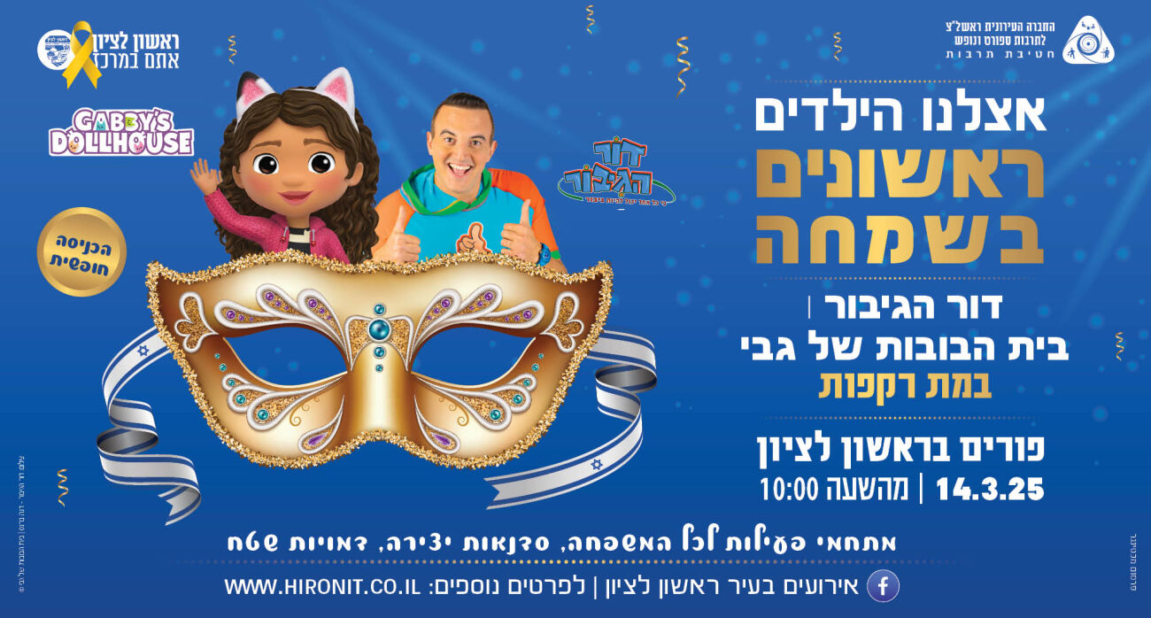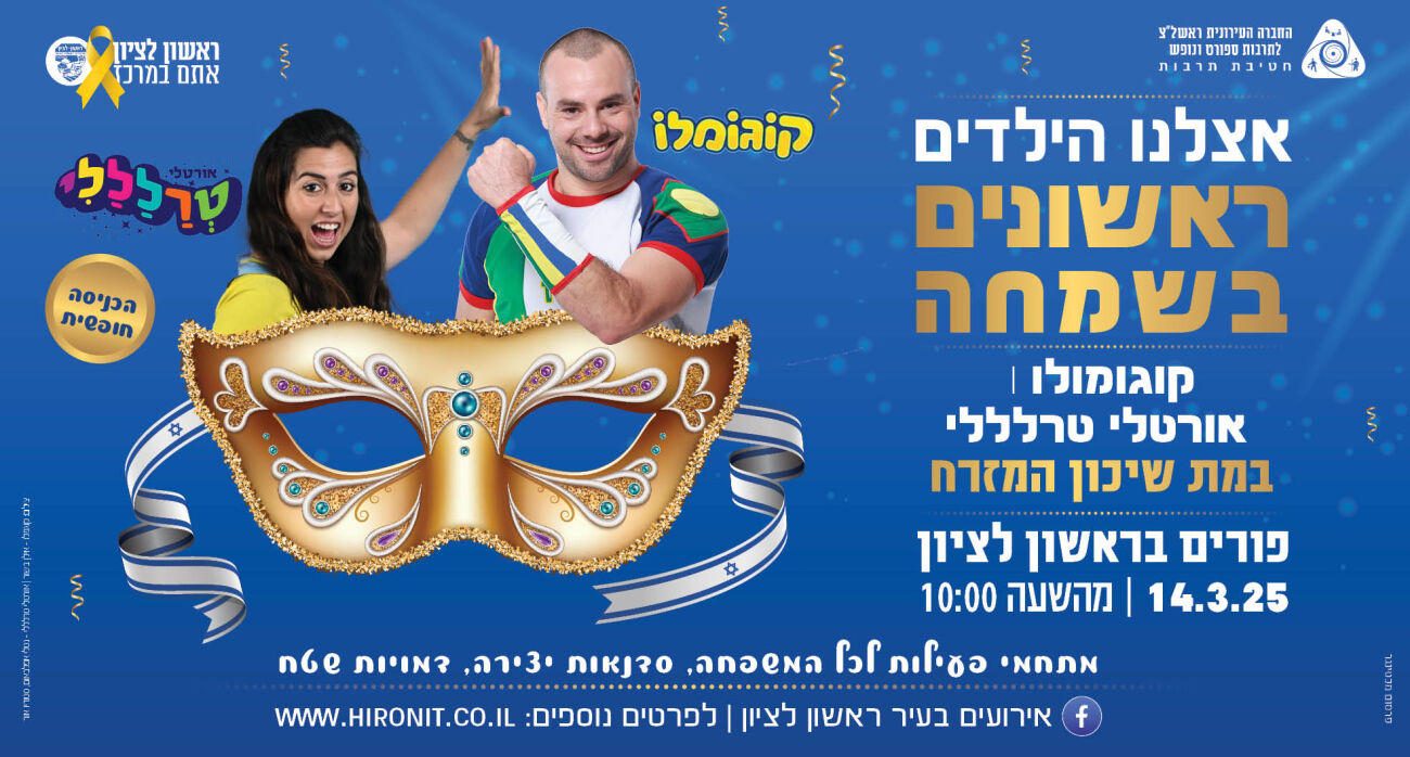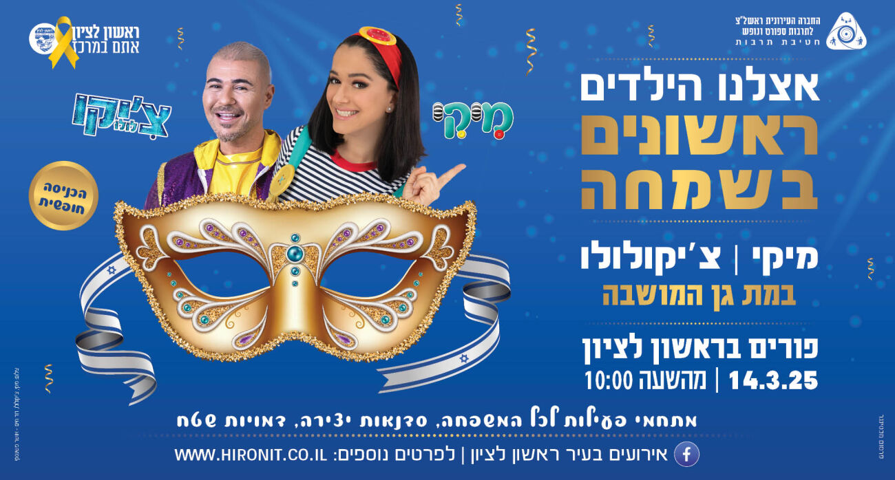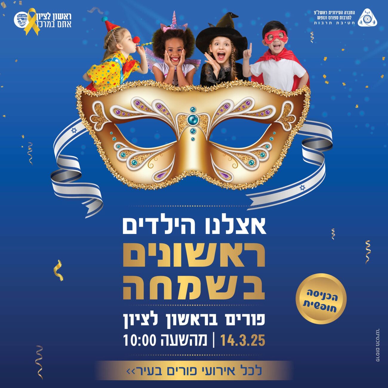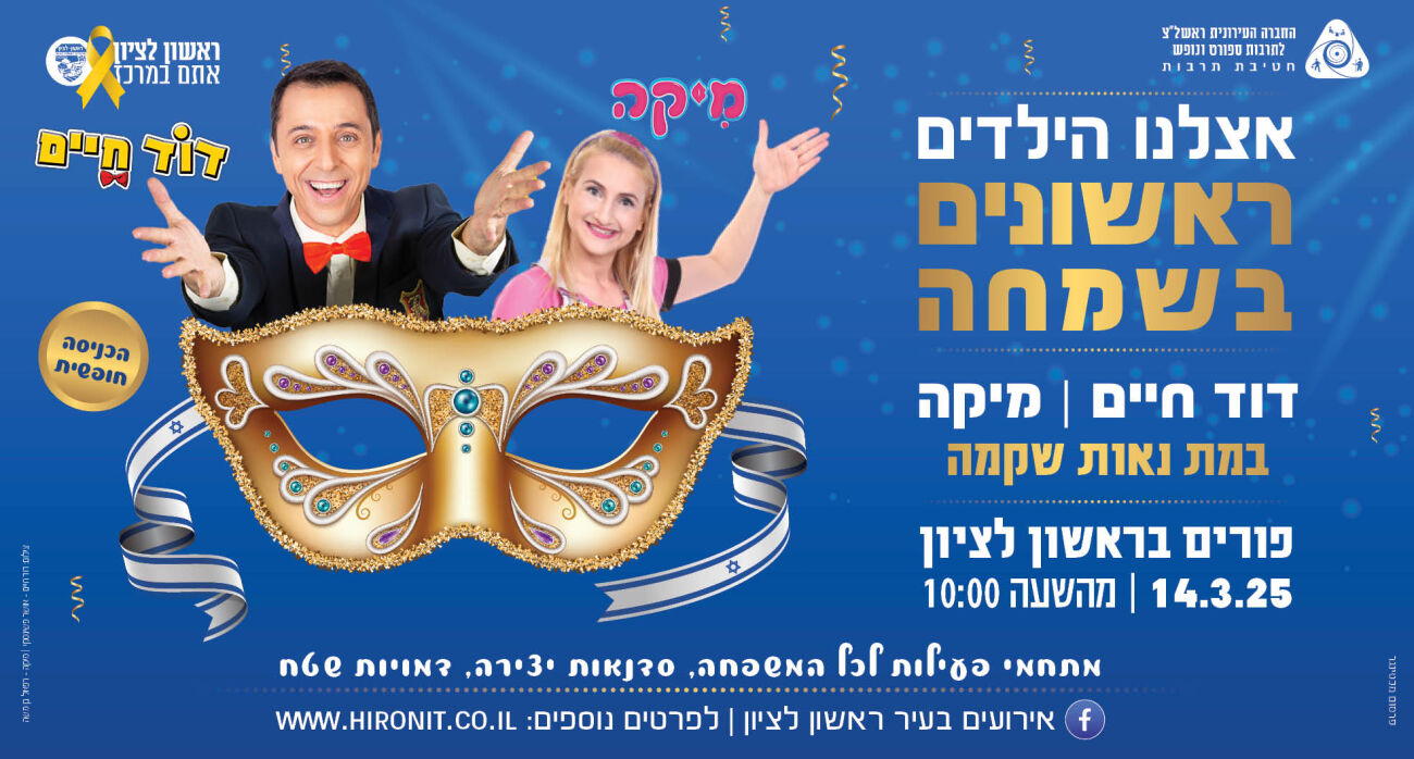 עיריית ראשון לציון והחברה העירונית מזמינים את התושבים לחגיגות פורים המרכזיות שיתקיימו בשישי 14.3.25 ב4 במות ברחבי העיר. הילדים יהנו מהופעות של מיטב כוכבי הילדים: מיקי, הדוד חיים, צ'יקולולו, הלהקות העירוניות, מתחמי פעילות ועוד