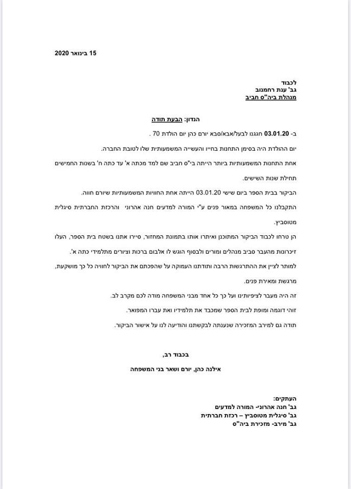המשפחה התרגשה מהאירוע ואף שלחה מכתב תודה והוקרה למנהלת וצוות בית הספר.