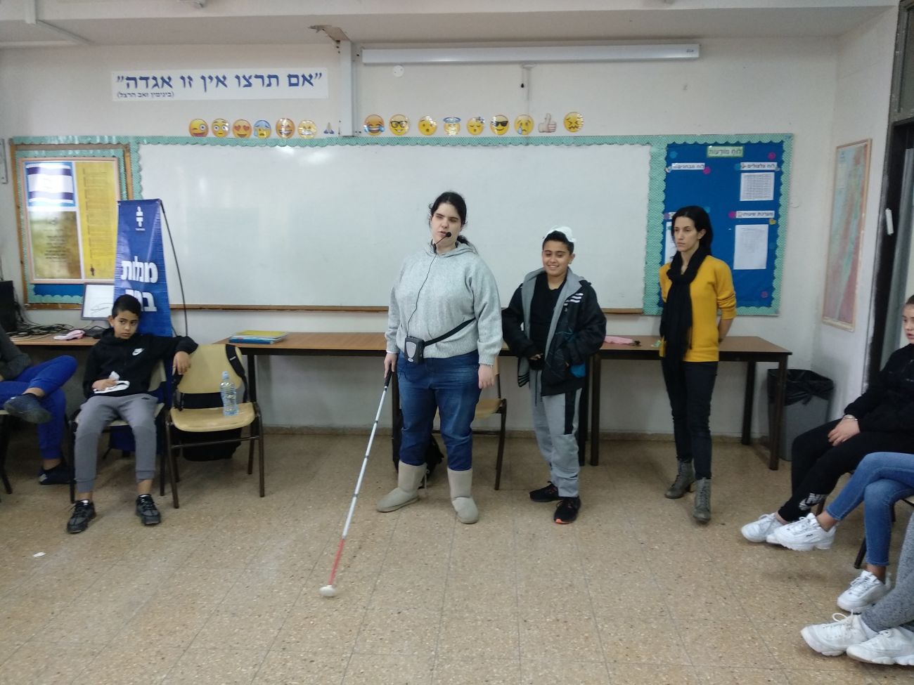 תלמידי מקיף ח' בראשון לציון "נכנסו" לנעלי המוגבלות כאשר התנסו בהתניידות בכיסא גלגלים בתוך מסלול, ביצוע פעולות שונות עם כיסויי עיניים לדימוי אובדן ראייה ותקשור ללא יכולת שמיעה.
