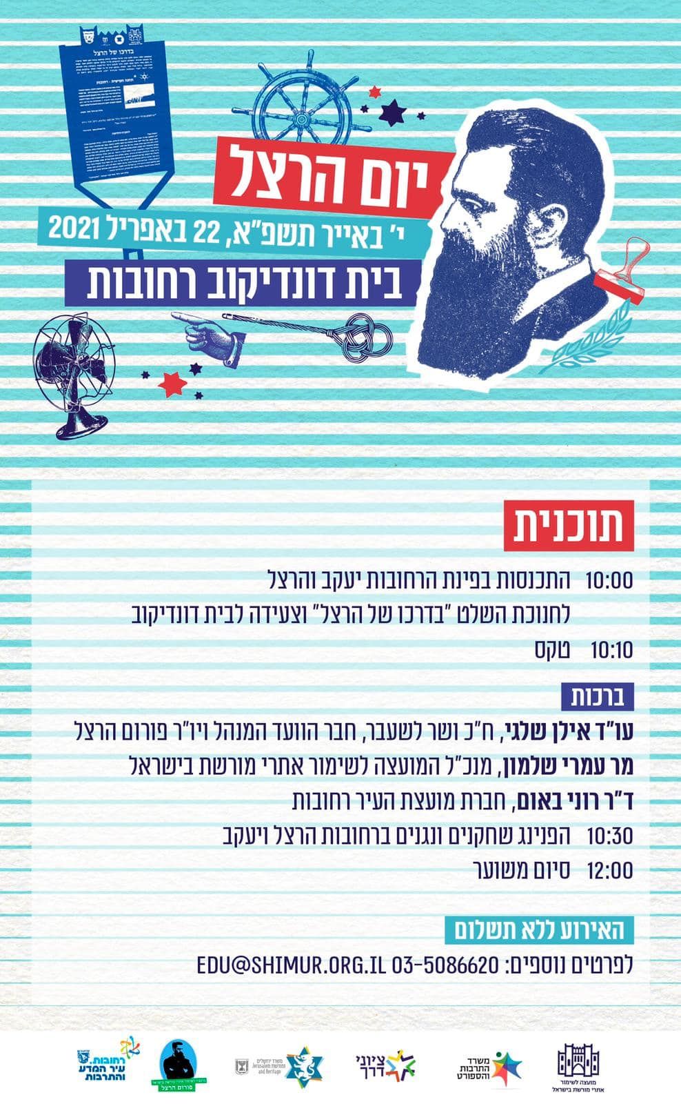 בשעה 10:00 - חנוכת השלט הכחול "בדרכו של הרצל" בפינת הרחובות הרצל ויעקב בהשתתפות ח"כ והשר לשעבר אילן שלגי, יוזם חוק הרצל, עמרי שלמון, מנכ"ל המועצה לשימור אתרי מורשת בישראל וד"ר רוני באום, חברת מועצת העיר רחובות.