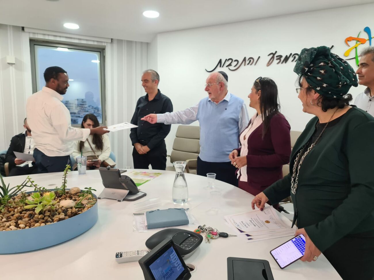 ביום שני בערב (27.2) הגיעו בוגרות ובוגרי הקורס לטקס חלוקת תעודות סיום מיוחד בלשכת ראש העיר רחמים מלול שם פגשו גם את חבר המועצה ומחזיק תיק ההתחדשות העירונית גיא צור ומנכ"ל העירייה מאיר דהן.