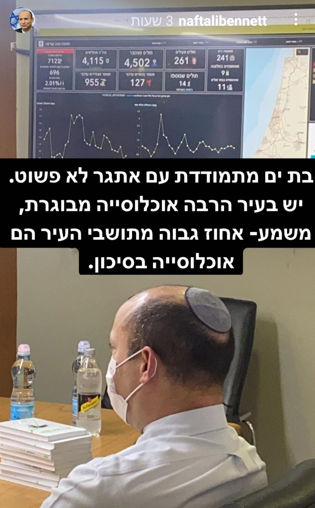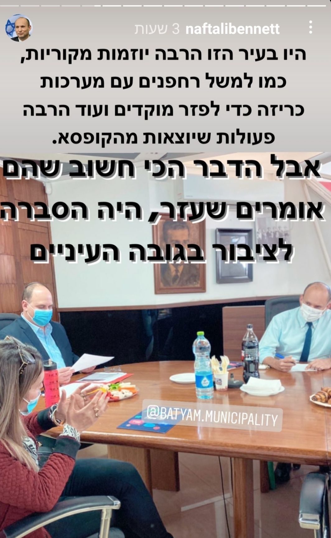 ח"כ ויו"ר ימינה, נפתלי בנט, ממשיך במסעו ברחבי ישראל והגיע השבוע לביקור בבת ים. במסגרת ביקור הוא נפגש עם ראש העירייה, צביקה ברוט וסגני ראש העיר, אורי בוסקילה, ואלי יריב, שספרו לו על ההתמודדות של העיר עם משבר הקורונה ומאמצם להורדת התחלואה. בהמשך יצא בנט לסיור בעיר בו נפגש עם בעלי העסקים ותושבים שספרו לו על ההתמודדות עם המשבר ומה הם חושבים על המצב.
