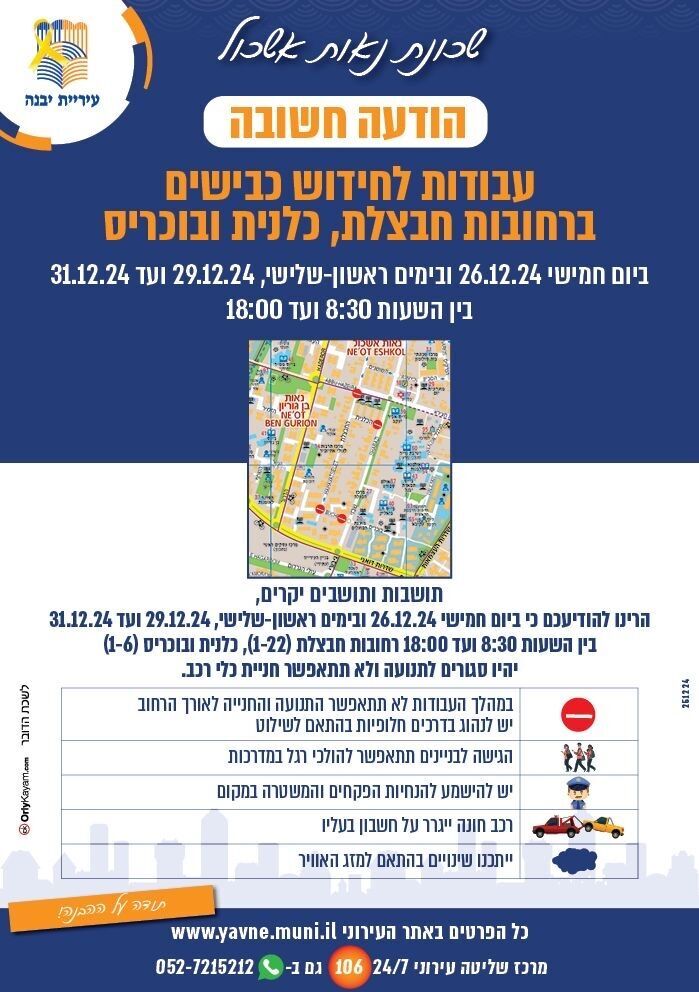 עבודות פיתוח כבישים ומדרכות ברחובות החבצלת, כלנית ובוכריס ביבנה בתאריכים 26-31 בדצמבר 2024