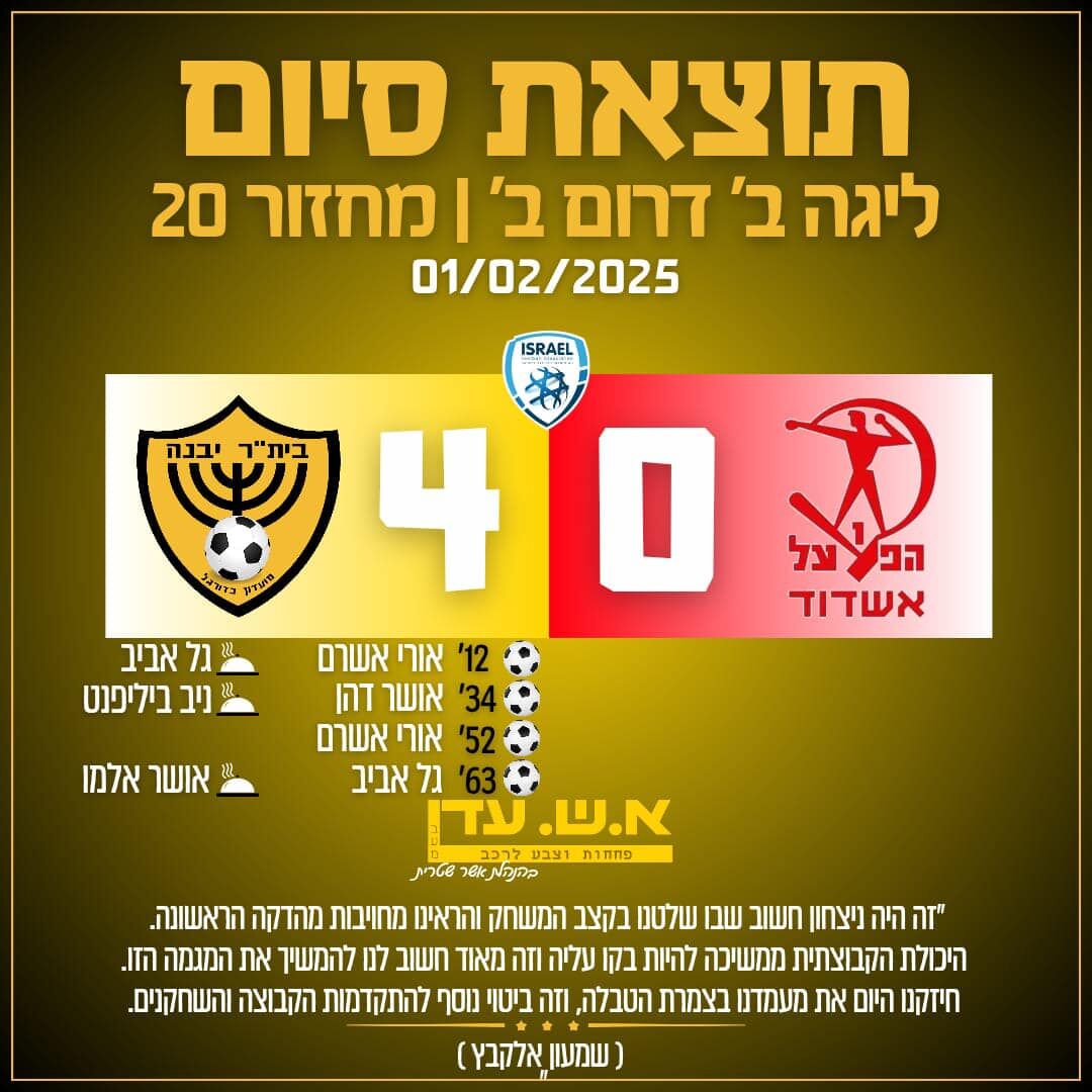 בית"ר יבנה יצאה אתמול מוצאי שבת למשחק חוץ נגד הפועל בני אשדוד וחוזרת עם ניצחון גדול 4 - 0.