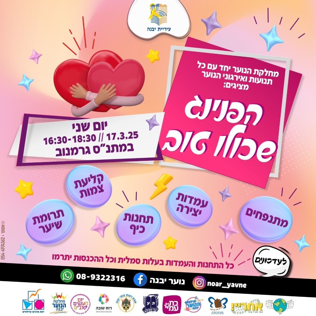 הפנינג מעשים טובים ביבנה - 17.3.25 במתנ"ס גרמנוב: תחנות כיף לכל המשפחה, דוכני מזון, עמדת קליעת צמות, עמדת תרומת שיער, מתנפחים , פעילות תיפוף