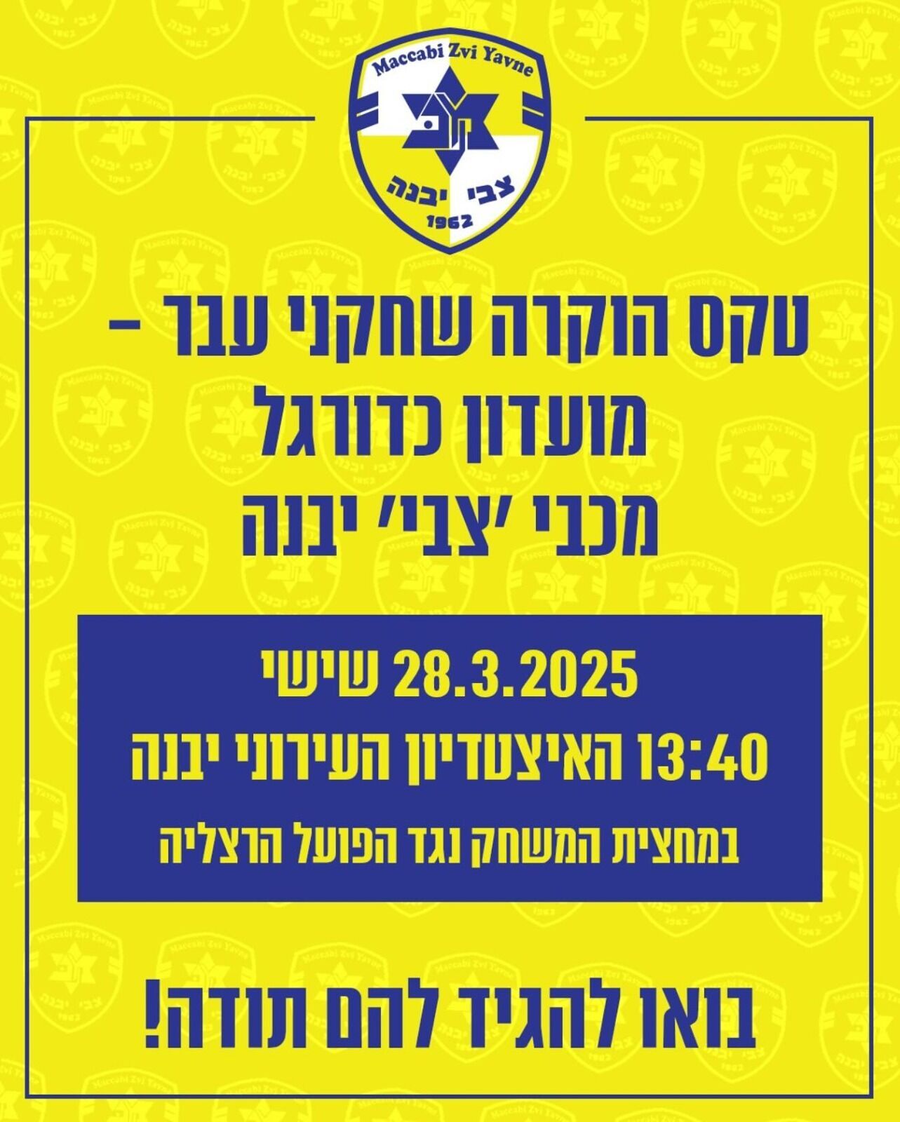 מועדון הכדורגל מכבי ׳צבי׳ יבנה מזמין את הציבור לטקס הוקרה מיוחד שייערך במהלך משחק הבית הקרוב נגד הפועל הרצליה, ביום שישי, ה-28 במרץ 2025, בשעה 13:40, באצטדיון העירוני ביבנה.