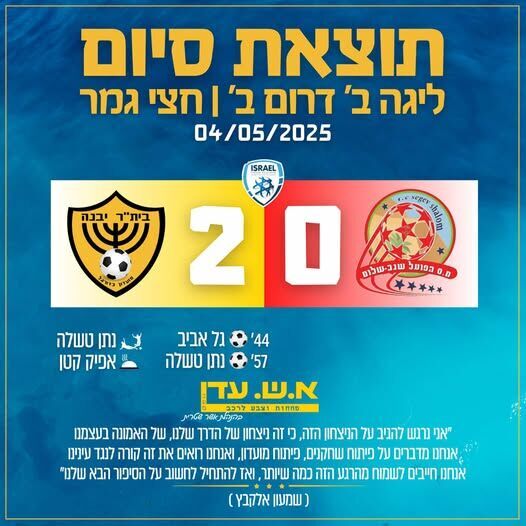 אתמול נערך בליגה ב' דרום ב' משחק חצי גמר פלייאוף עליון, בית"ר יבנה במשחק חוץ נגד שגב שלום אשר הסתיים בניצחון יבנה 2 - 0 משערים של גל אביב ונתן טשלה.