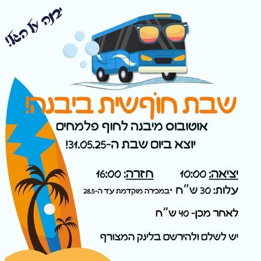 תושבי יבנה מוזמנים להצטרף ליוזמה קהילתית חדשה בשם "שבת חוףשית", המציעה הסעות מאורגנות מחלקי העיר יבנה אל חוף פלמחים בכל שבת. היוזמה היא פרטית ובלתי תלויה, ומטרתה לאפשר לכלל התושבים, ובמיוחד לבני הנוער, ליהנות מהקיץ ומהים.