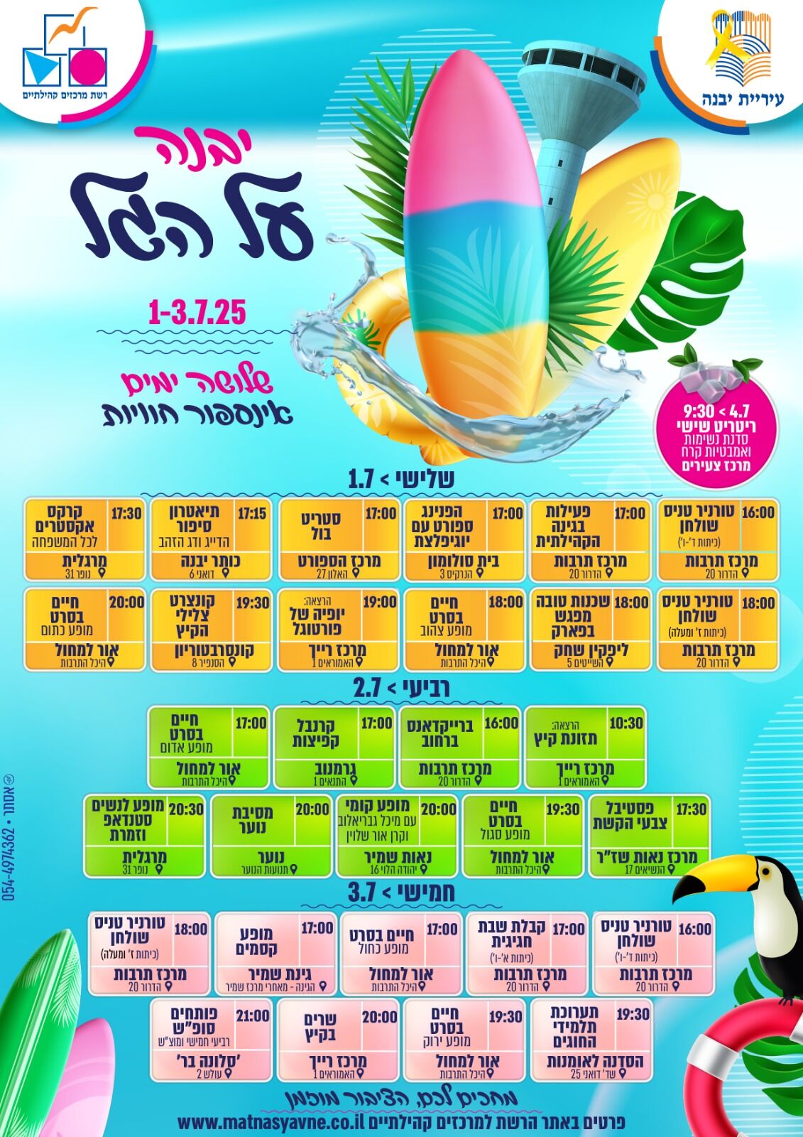 הרשת למרכזים קהילתיים ביבנה פותחת את הקיץ באירוע "יבנה על הגל", שיתפרס על פני שלושה ימים ויכלול חוויות רבות לכל המשפחה.