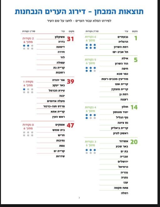 בראש הדירוג, עם ציון מושלם של 6 מתוך 6, ניצבות הערים גבעתיים, הרצליה, רמת השרון ותל אביב. אחריהן, עם 5 נקודות, נמצאות בין היתר אילת, חיפה, כפר סבא ורמת גן. את הרשימה סוגרות ערים שקיבלו 0 נקודות, ובהן אופקים, בית שמש, צפת ושדרות.