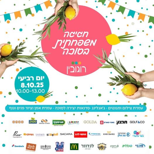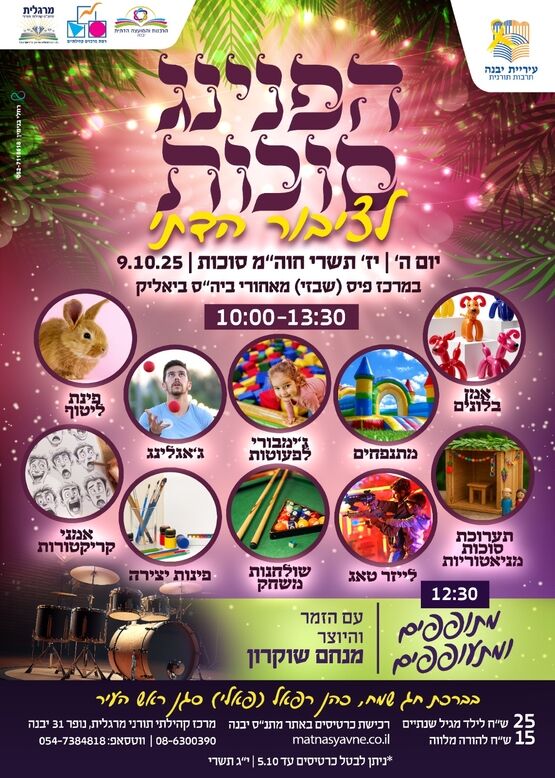 עיריית יבנה תקיים פסטיבל סוכות לילדים ביום חמישי, 9 באוקטובר 2025, באמפי Y.PARK בעיר. האירוע, המוגדר כחוויה צבעונית, מצחיקה ומוסיקלית, יחל עם פתיחת שערים בשעה 16:00, כאשר המופעים יתחילו בשעה 16:30.