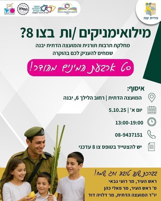 חלוקה חינם למילואימניקים ביבנה: התרבות התורנית והמועצה הדתית יעניקו סטים מהודרים של ארבעת המינים בחינם לחיילי מילואים המשרתים בצו 8