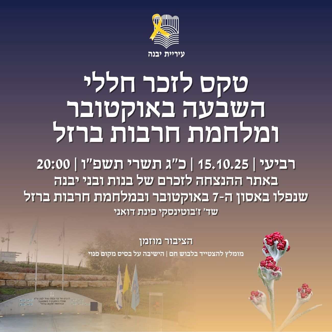 רביעי, 15.10 | 20:00 טקס באתר ההנצחה לזכרם של בנות ובני יבנה שנפלו באסון ה-7 באוקטובר ובמלחמת חרבות ברזל.
