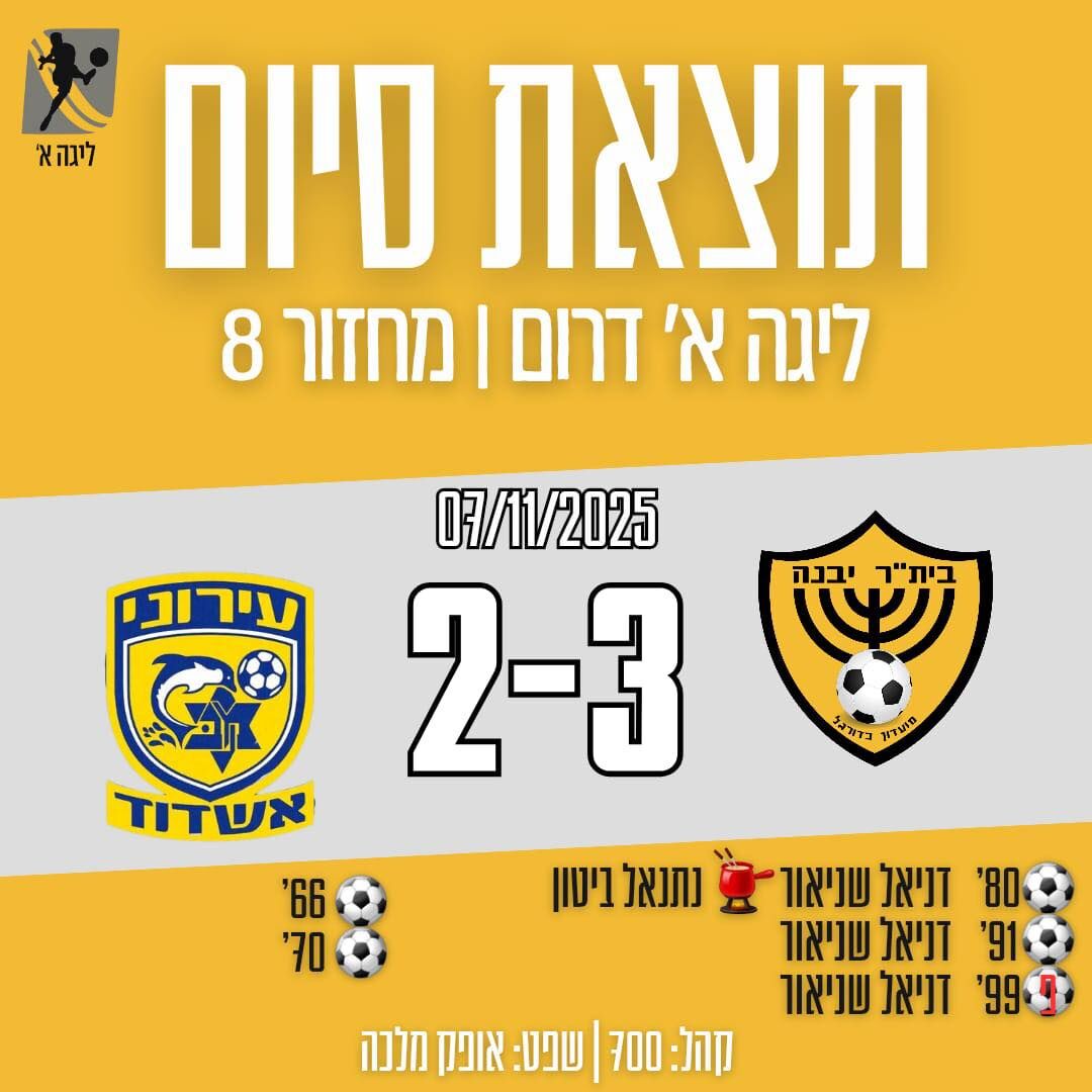 בית"ר יבנה ארחה בבית את עירוני אשדוד ולאחר שבדקה 70, יבנה פיגרה 2 - 0. בית"ר יבנה בדקה ה - 80 ביצעה מהפך וכבשה 3 שערים כאשר את 3 השערים כבש דניאל שניאור.