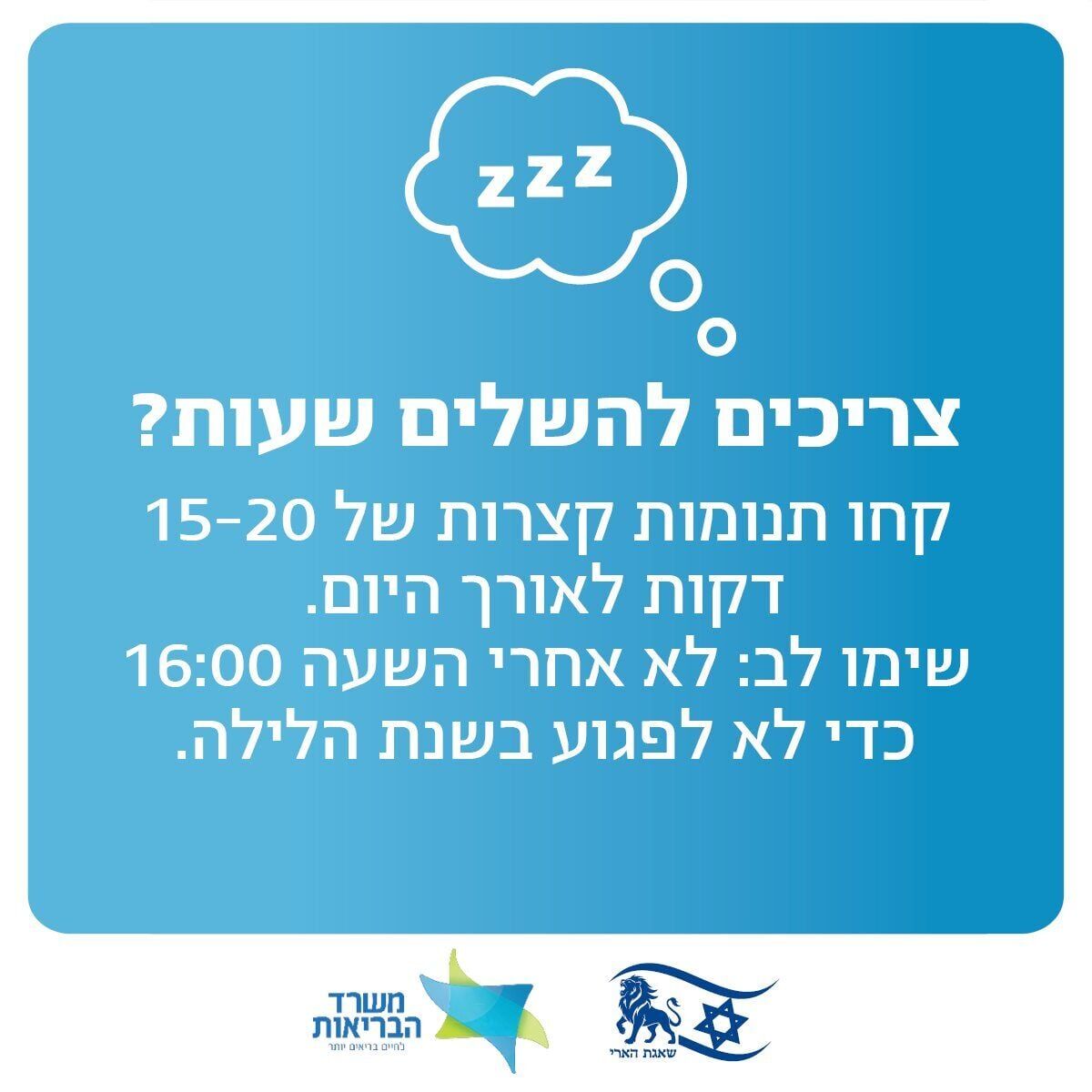 - השלמת שעות שינה: למי שזקוק להשלמת שעות עקב יקיצות במהלך הלילה, ההמלצה היא לקחת תנומות קצרות של 15 עד 20 דקות לאורך היום. עם זאת, מודגש כי יש להימנע משינה לאחר השעה 16:00 אחר הצהריים כדי לא לפגוע בשנת הלילה.