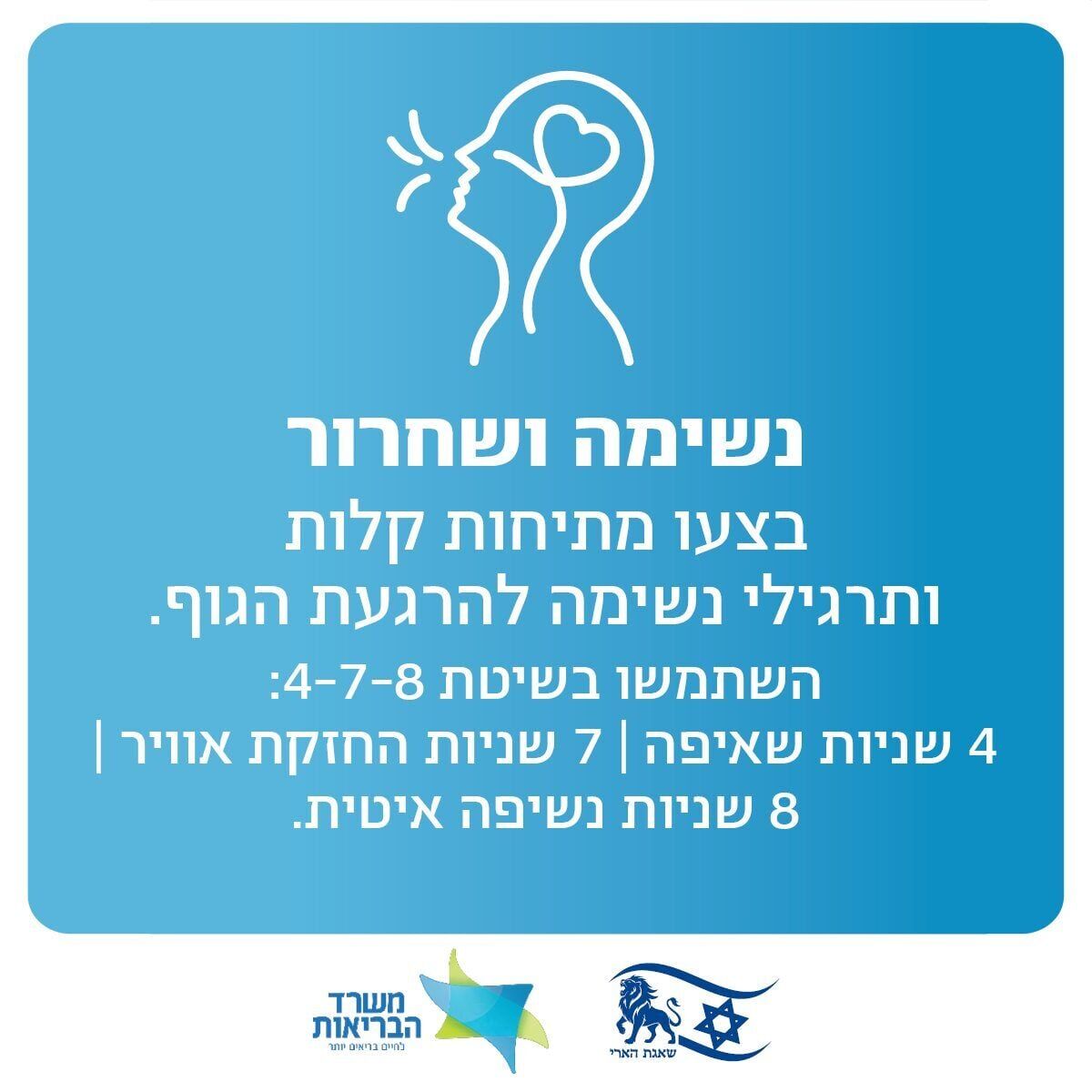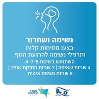 - נשימה ושחרור: מומלץ לבצע מתיחות קלות ותרגילי נשימה להרגעת הגוף. במשרד ממליצים להשתמש בשיטת "4-7-8": שאיפת אוויר במשך 4 שניות, החזקת האוויר למשך 7 שניות ונשיפה איטית שתימשך 8 שניות.