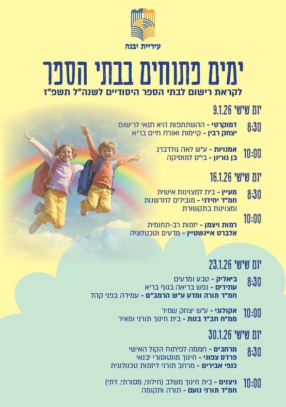 לקראת הרישום לכיתות א' לשנת הלימודים תשפ"ז: עיריית יבנה מפרסמת את מועדי הימים הפתוחים בבתי הספר היסודיים לינואר 2026