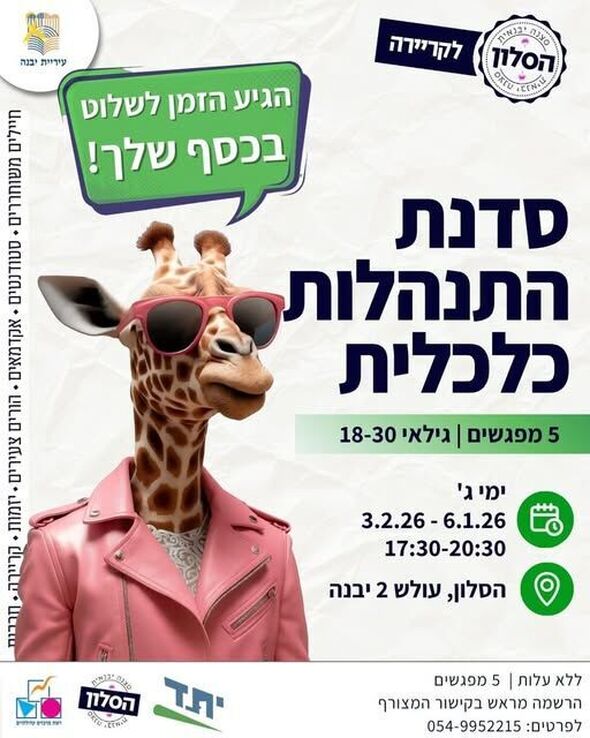 מרכז הצעירים "הסלון" ביבנה פותח סדנה חדשה להתנהלות כלכלית המיועדת לצעירים בגילאי 18 עד 25. הסדנה נועדה להעניק למשתתפים כלים לניהול נכון של כספם ולעשיית סדר בהתנהלות הפיננסית האישית.