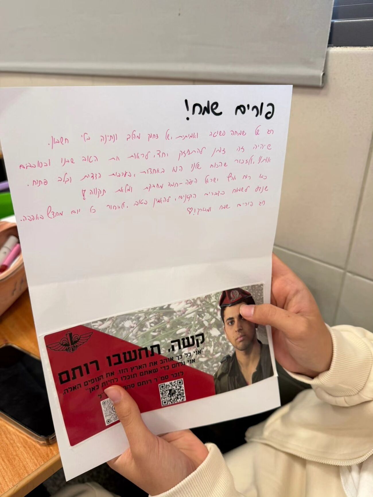 במסגרת היוזמה, אותה הובילה אסתר ביטון, הכינו תלמידי כיתת 5 יחידות לימוד באנגלית משלוחי מנות וברכות. החבילות מיועדות לחלוקה בבתי חולים, כפעילות חסד לזכרו של הנופל.