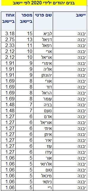 השם הנפוץ. ביותר ביבנה לבנים בשנת 2020 הוא לביא ולבנות מאיה
