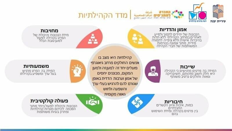 מדד הקהילתיות, סקר אנונימי שבו יכולים התושבים לחלוק את עמדותיהם וחוויתם מהחיים ביבנה, בשכונה בה הם גרים, בקהילה הסובבת אותם יחס עם השכנים וכו.