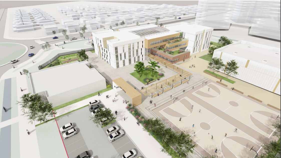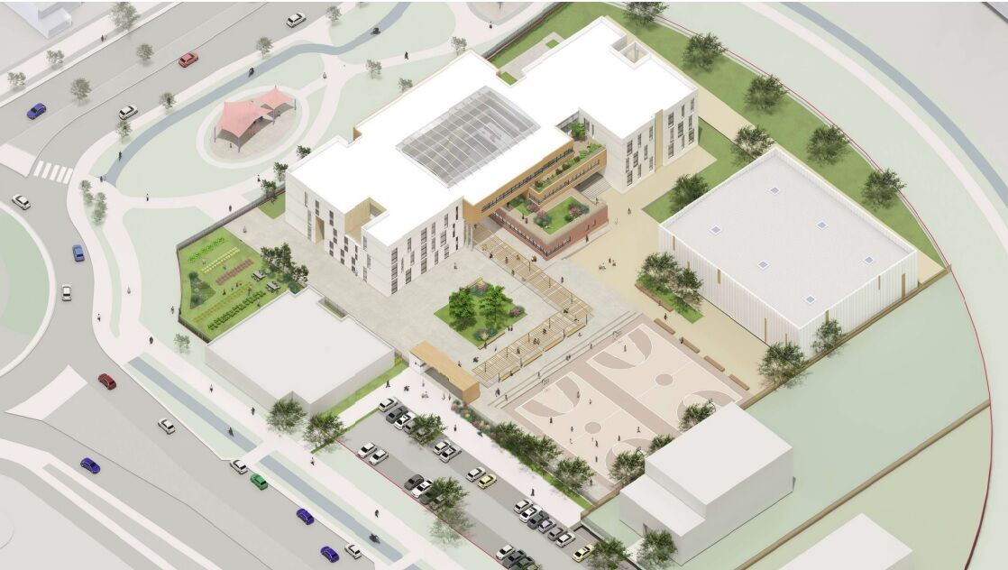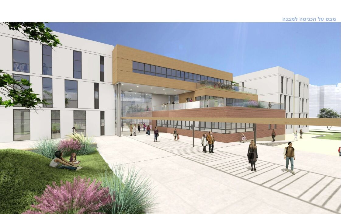 הדמיות מבנה תיכון האולפנה החדש אשר ייבנה בכניסה לשכונה הירוקה בפינת הרחובות ז'בוטינסקי וחטיבת גבעתי הכולל אולם ספורט