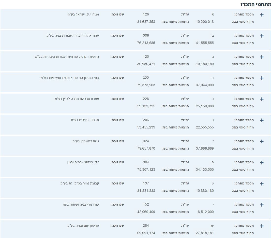 רשימת הקבלנים הזוכים - מספר הדירות בכל מתחם - סכום הזכייה