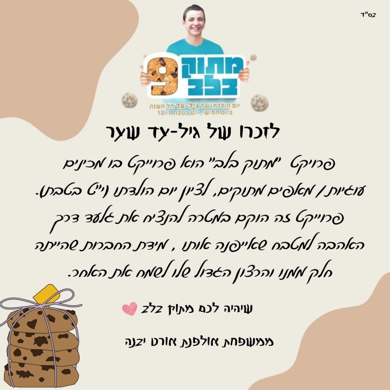 לזכרו של הנער החטוף גיל-עד שער ז"ל אשר נחטף ונרצח על ידי מחבלים! בנות אולפנת אורט יבנה יצאו למרכזים המסחריים ביבנה לחלק מיני מתוקים במסגרת מבצע "מתוק בלב"