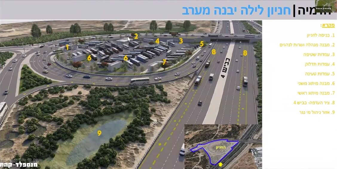 1. מיקום - כאשר באים בכביש 4 מכיוון תל אביב ופונים בלולאה של גשר יבנה, מרכז הלולאה יהפוך לחניון לילה לאוטובוסים.