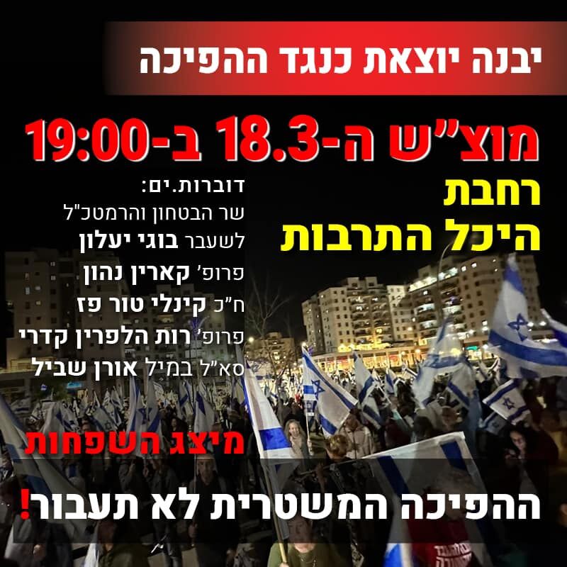 הפגנות ביבנה! מחר מוצאי שבת 2 הפגנות בעד ונגד הרפורמה המשפטית, ארגוני הימין מארגנים לראשונה הפגנת תמיכה בשכונת נאות שמיר, ארגוני השמאל מארגנים שבת רביעית של הפגנת נגד ברחבת היכל התרבות