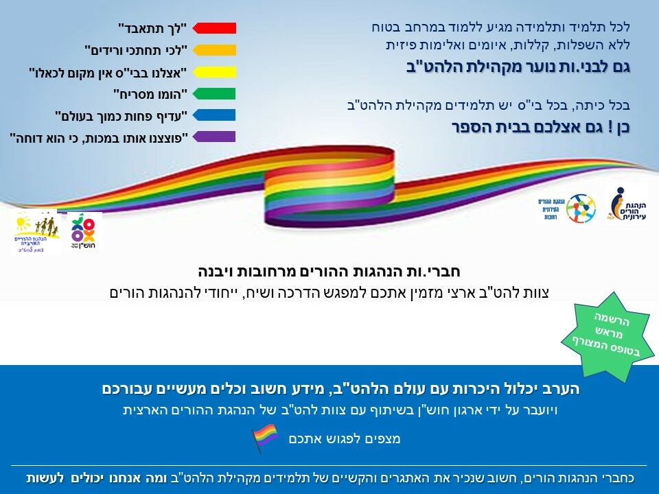 תלמידים רבים מקהילת הלהט"ב סובלים מהצקות, בריונות, השפלות ואלימות מילולית ופיזית. אנו בהנהגות ההורים רואים חשיבות רבה במציאת מענה הולם ויצירת מרחב מוגן ובטוח לכלל התלמידים וביניהם לתלמידים להט"בים.