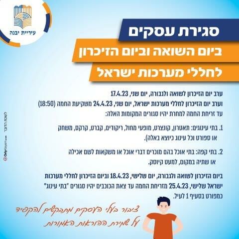 תושבי יבנה שימו לב, בערב יום הזיכרון לשואה ולגבורה ,יום שני 17.4 ובערב יום הזיכרון לחללי מערכות ישראל 24.4 , יסגרו בזמן שקיעת החמה, בשעה 18:50 בתי העסק הבאים: