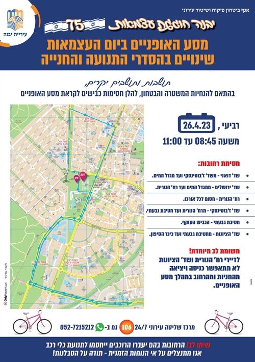 מצורפת רשימת החסימות לקראת מסע האופניים שיתקיים ביבנה ביום העצמאות 26.4