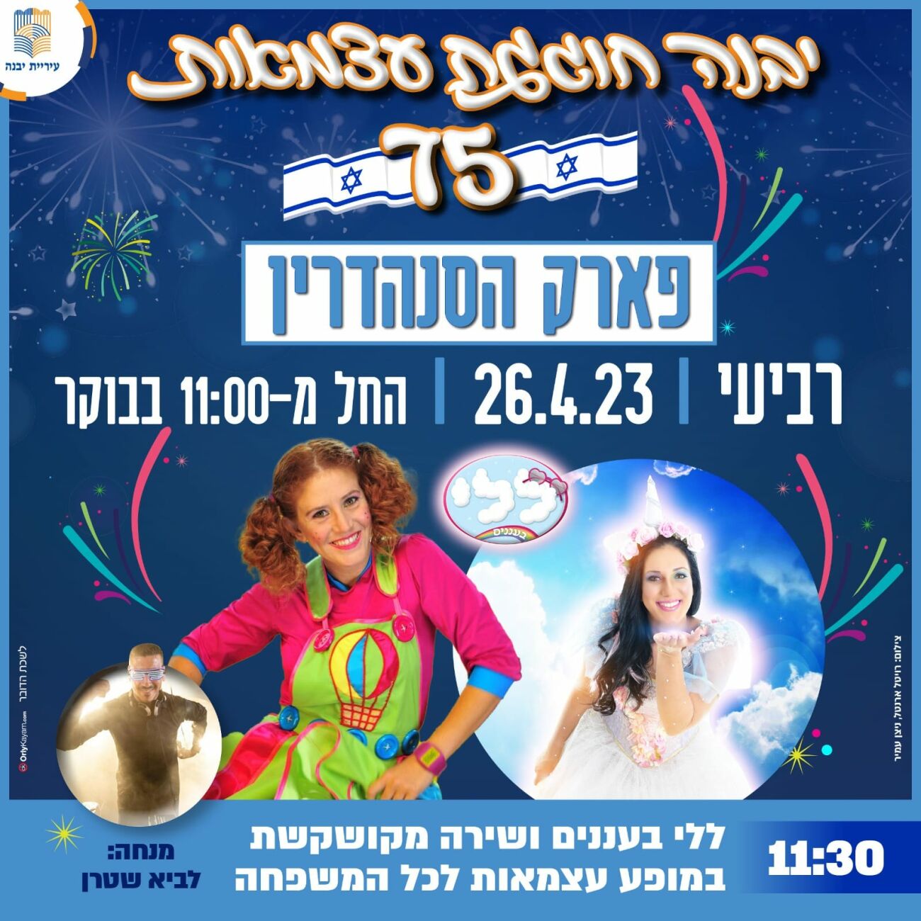 יום העצמאות למשפחות ביבנה- בערב יום העצמאות יוקם מתחם פעילות לקטנטנים בבית הספר נבון, וביום רביעי החל מ11 בבוקר יתקיים מופע עצמאות לכל המשפחה בפארק הסנהדרין.