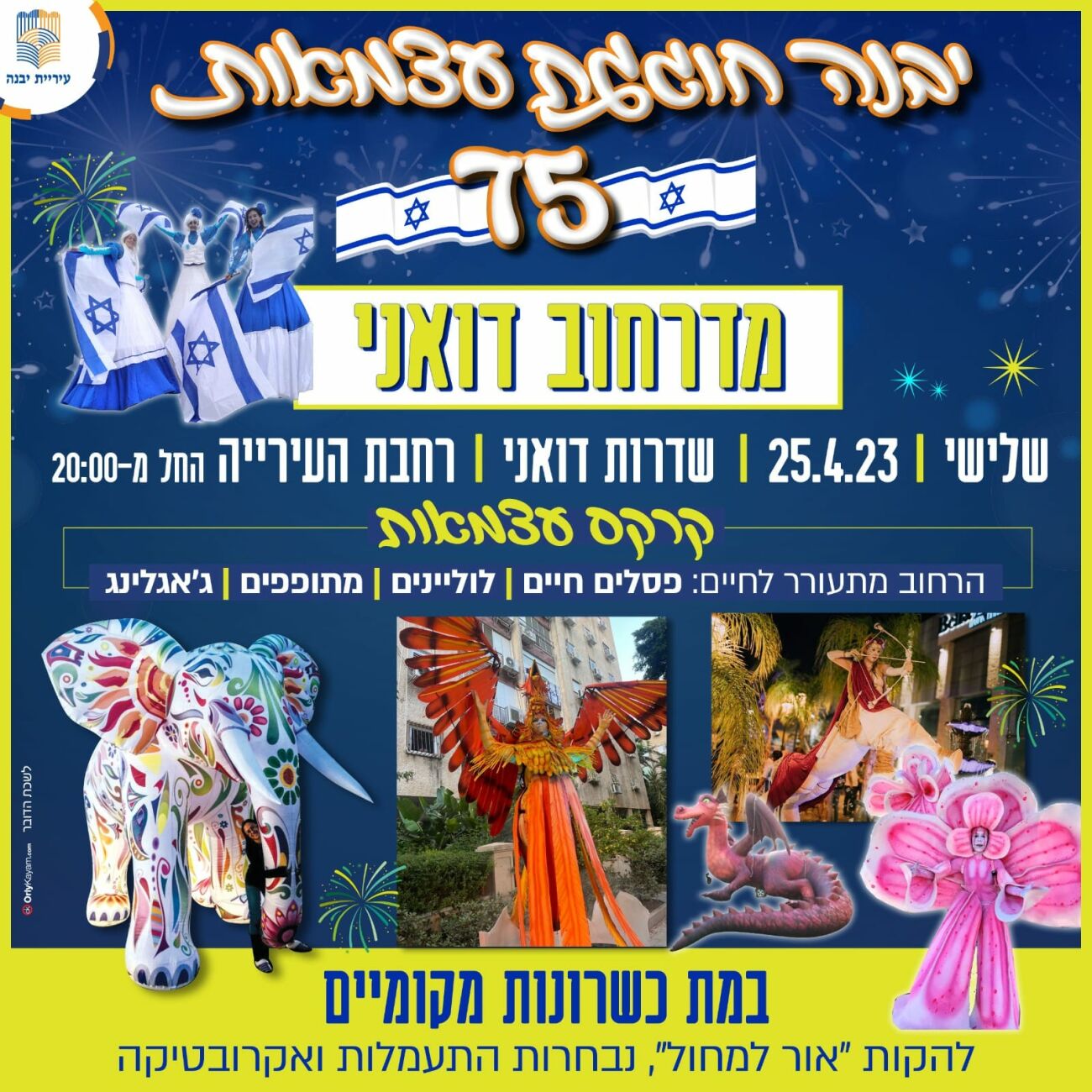 לכבוד יום העצמאות ה-75 למדינת ישראל תקיים עיריית יבנה באמצעות מחלקת האירועים והרשת למרכזים קהילתיים את אירועי ערב עצמאות 2023 ברחבי העיר עם אומנים מובילים. השנה הורחבו מתחמי החגיגות ולרשות החוגגים יעמוד מערך היסעים שיזמה העירייה עם תחנות במסלול מעגלי שיעברו בין הבמות.