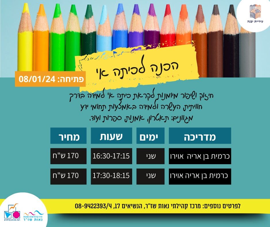מרכז קהילתי נאות שז"ר ביבנה מציע תכנית הכנה לכיתה א' בהנחיית כרמית בן ארי, בעלת תואר ראשון בחינוך לגיל הרך. התכנית תכלול הקניית מושגי יסוד הנדרשים בבית הספר, מוכנות רגשית וחברתית, פיתוח מוטוריקה עדינה, ופיתוח מושגי יסוד בחשבון וכתיבה. ההרשמה פתוחה כעת וניתן לשריין מקום במזכירות נאות שז"ר.