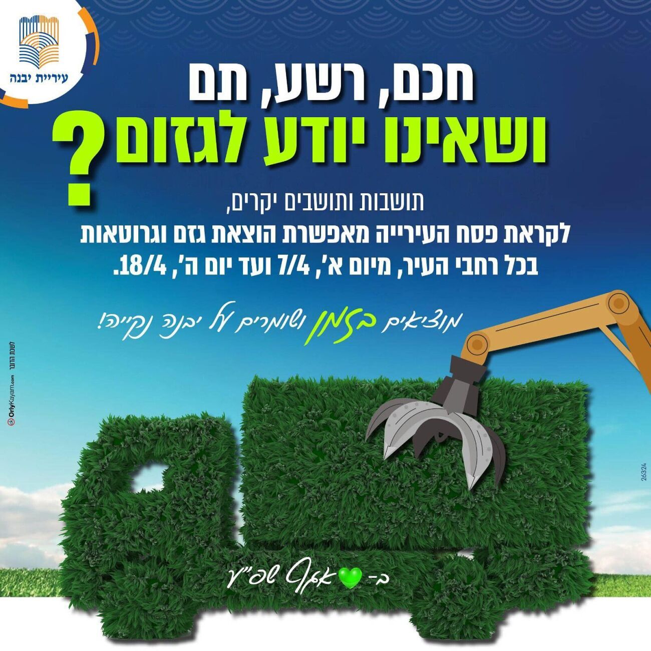 הוצאת גזם וגרוטאות ביבנה! לקראת פסח תותר הוצאת הגזם החל מתאריך 7 עד ה-18 באפריל ללא קשר לימי הפינוי הרגילים