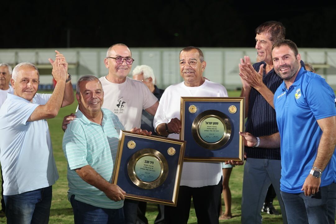 מכבי יבנה קיימו טקס הוקרה מרגש חברי הנהלה ושחקני עבר במחצית המשחק נגד הפועל מרמורק: מיכאל פיטוסי, משה עזרן, מיימון בן אבו, משה מלכה, ששון ישראל ופיני שגב