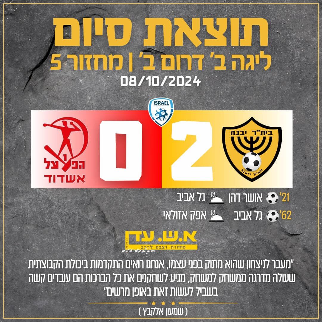 בית"ר יבנה ארחה אתמול את הפועל בני אשדוד וניצחה 2 - 0.