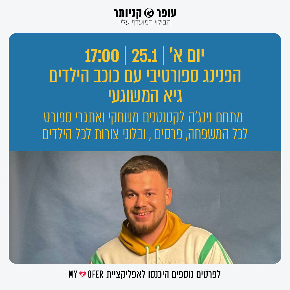 הפנינג ספורטיבי לילדים ולהורים בעופר הקניותר בנס ציונה: מתחם נינג'ה, אתגרים ומופע של כוכב הילדים גיא המשוגעי ביום ראשון ה-25.1