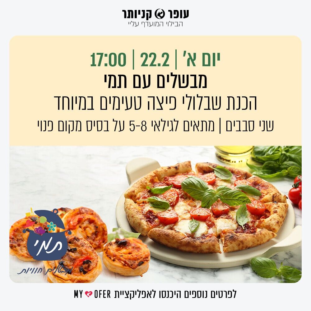 ביום ראשון הקרוב, ה-22 בפברואר, בשעה 17:00, תשוב לקניון המפעילה תמי לסדנת "מבשלים עם תמי". הפעם תתמקד הסדנה בהכנת שבלולי פיצה. הפעילות מותאמת לילדים בגילאי 5 עד 8 ותתקיים בשני סבבים, בדינמיקה של בסיס מקום פנוי.