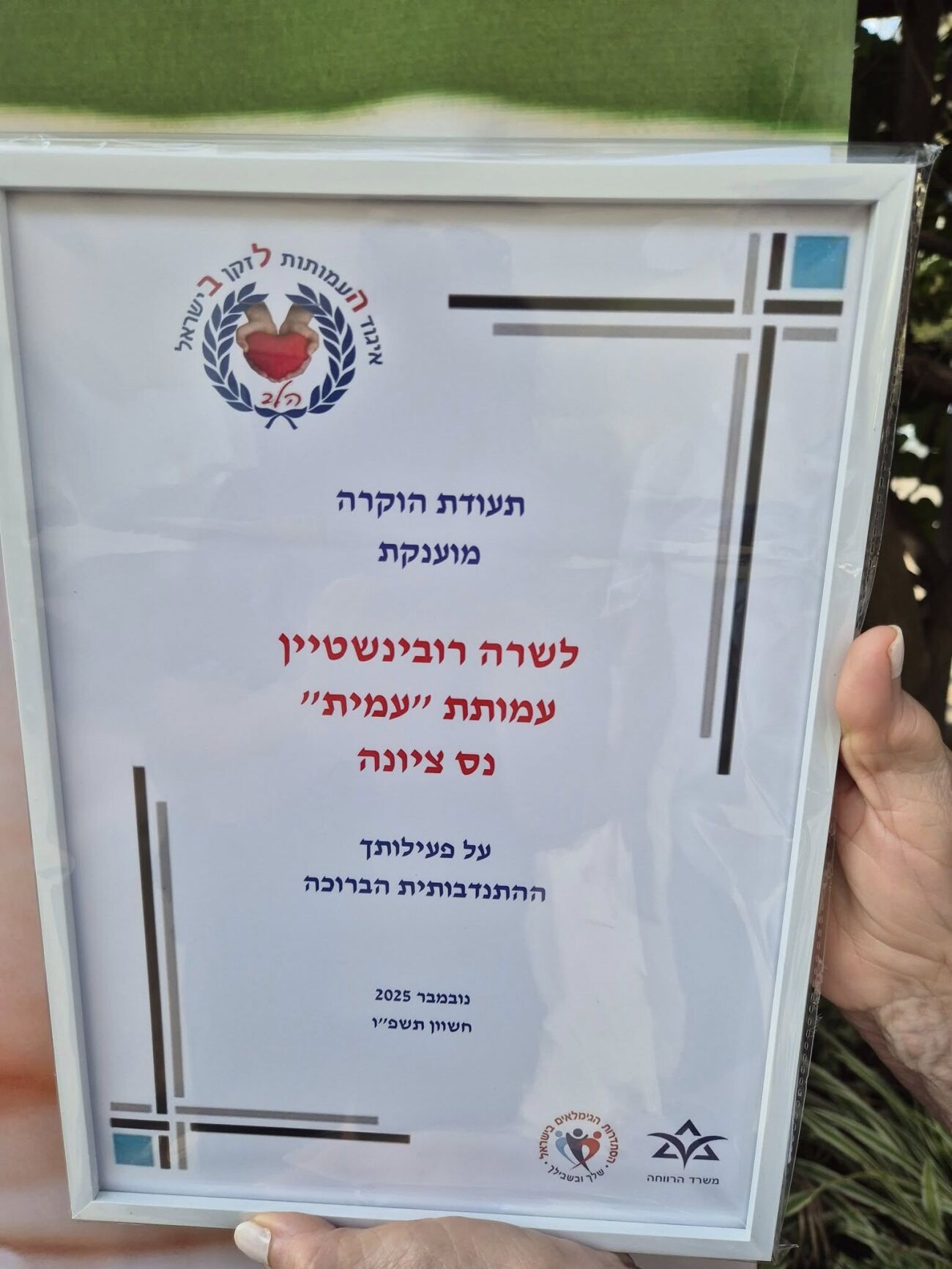 אות הוקרה ארצי למתנדבת מנס ציונה: שרה רובינשטיין זכתה בפרס על 11 שנות התנדבות עם שורדי שואה ותשושי נפש