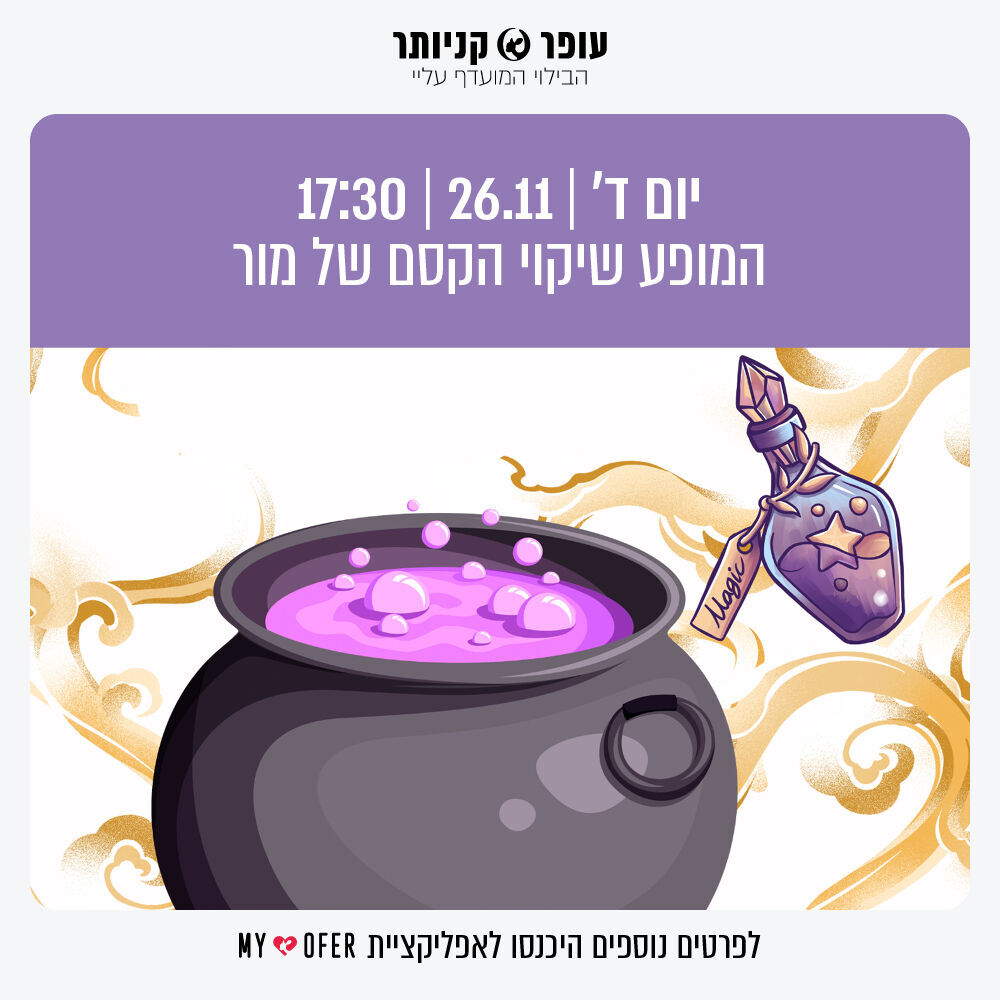 שבוע מלא בקסמים לילדים בעופר הקניותר בנס ציונה: מופע קסמים עם ארז משה ביום ראשון 23.11 ומופע "שיקוי הקסם" של מור ביום רביעי 26.11