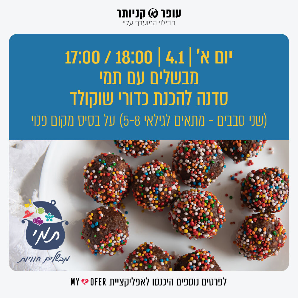 ביום ראשון, ה-4.1, בשעה 17:00, תתקיים הפעילות "מבשלים עם תמי". מדובר בסדנה להכנת כדורי שוקולד בהנחיית כוהנת סדנאות הבישול.