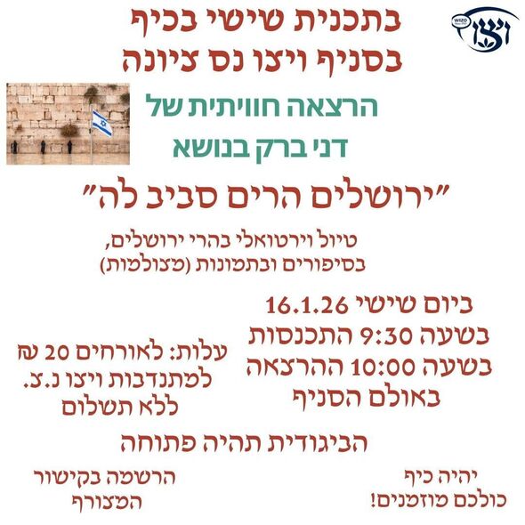 אירועי השבוע בסניף ויצו נס ציונה: הרצאה מפי איש שב"כ על מרגל הגרעין מרדכי וענונו ב-12.01 והרצאה חווייתית על הדרך לירושלים ב-16.01