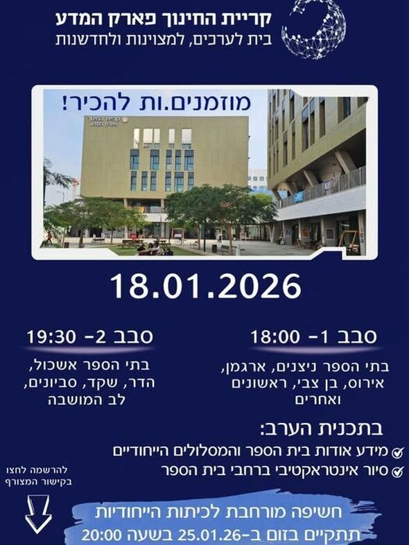 קריית החינוך השש שנתית "פארק המדע" בנס ציונה הודיעה על קיום ערב חשיפה מיוחד לקראת שנת הלימודים הבאה. האירוע מיועד לתלמידים ולתלמידות המסיימים את כיתות ו' ברחבי העיר ולהוריהם.