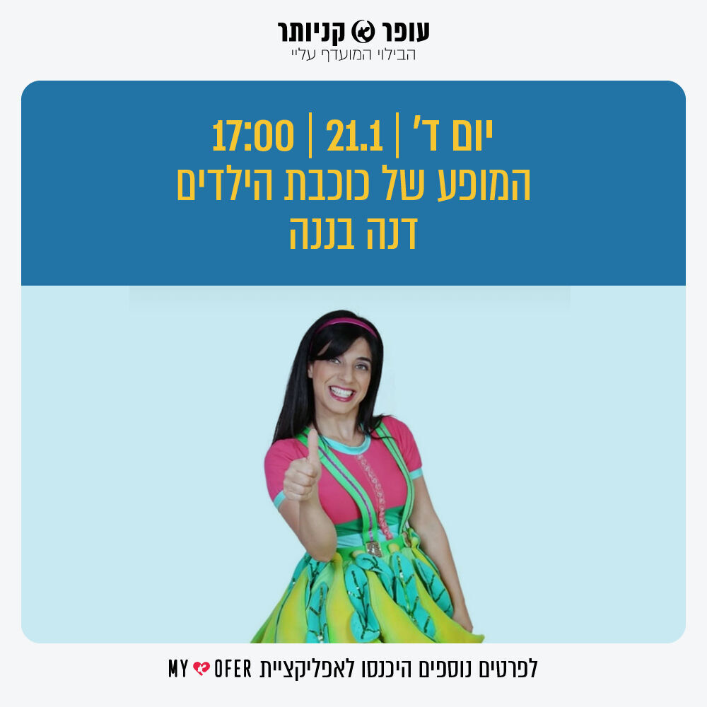 פעילויות השבוע לילדים בעופר הקניותר בנס ציונה: סדנת בישול להכנת רוגלך ומופע של כוכבת הילדים דנה בננה בתאריכים 18.1 ו-21.1