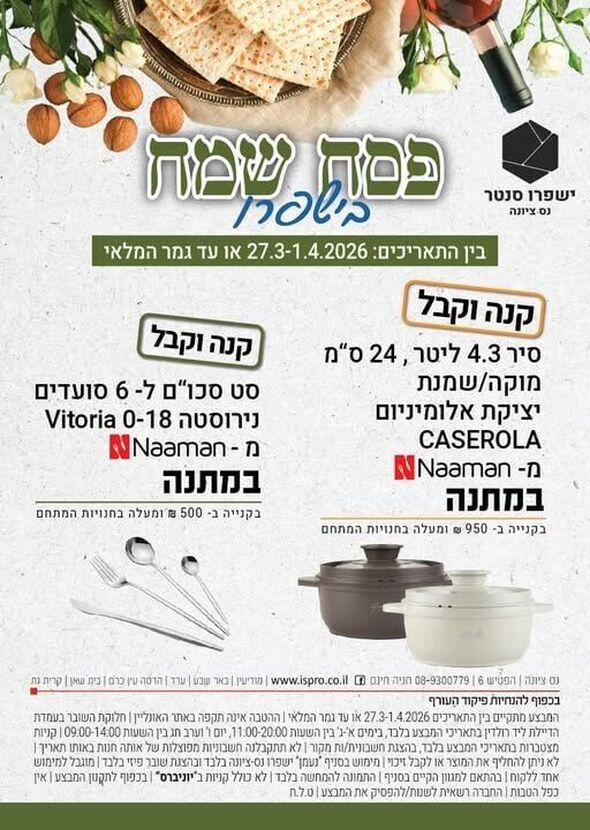 מתחם הקניות והבילוי ישפרו סנטר בנס ציונה מכריז על מבצע מיוחד לקראת חג הפסח, המאפשר למבקרים ליהנות ממתנות על רכישותיהם. המבצע מתקיים החל מהיום, תאריך 27.3.2026 ועד ל-1.4.2026, או עד גמר המלאי.