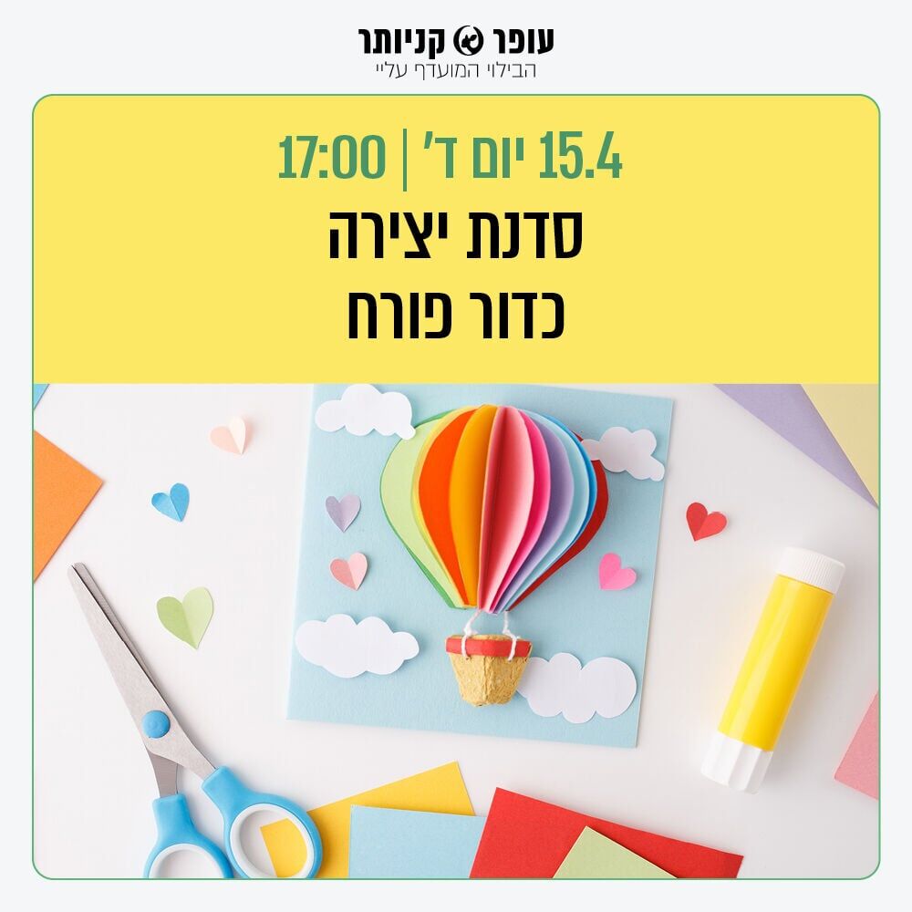 ביום רביעי הקרוב, ה-15 באפריל, בשעה 17:00, תתקיים נערכת יצירה מיוחדת לילדים. במסגרת מוקד הפעילות, המשתתפים יכינו יחדיו יצירה של כדור פורח מרהיב.