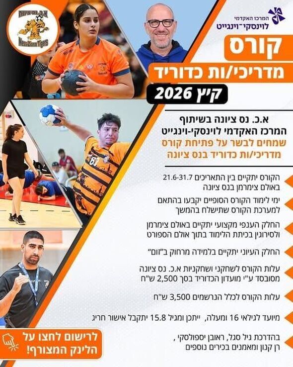 מועדון הכדוריד א.כ. נס ציונה, בשיתוף פעולה עם המרכז האקדמי לוינסקי-וינגייט, מודיעים על פתיחת קורס להכשרת מדריכי ומדריכות כדוריד לקיץ 2026. הקורס, שיתקיים בין התאריכים 21 ביוני ל-31 ביולי, ייערך באולם צימרמן בעיר נס ציונה.